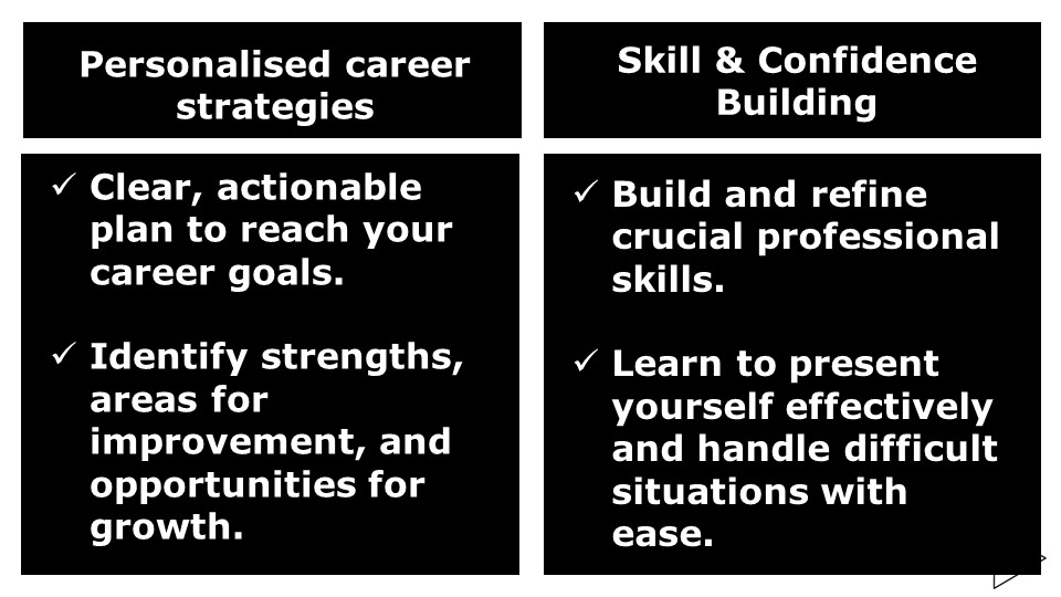 - Personalized Career Strategies: Develop a clear and actionable plan to reach your career goals. Our coaching works with you to identify your strengths, areas for improvement, and opportunities for growth.